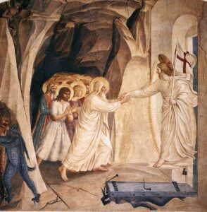 Another painting which comes to my mind as I read Malcolm Guite’s poem, is this painting from 1442 by Fra Angelico, entitled “Christ in Limbo.” It was a popular theme in the middle ages, to depict scenes of Jesus Christ descending into hell to release the prisoners. This all-powerful Jesus is purposeful and strong, and kicks the door off its hinges to rescue God’s people from Satan’s imprisonment. There is a comical element in the unfortunate demon who is squished under the force of the door being blown open.